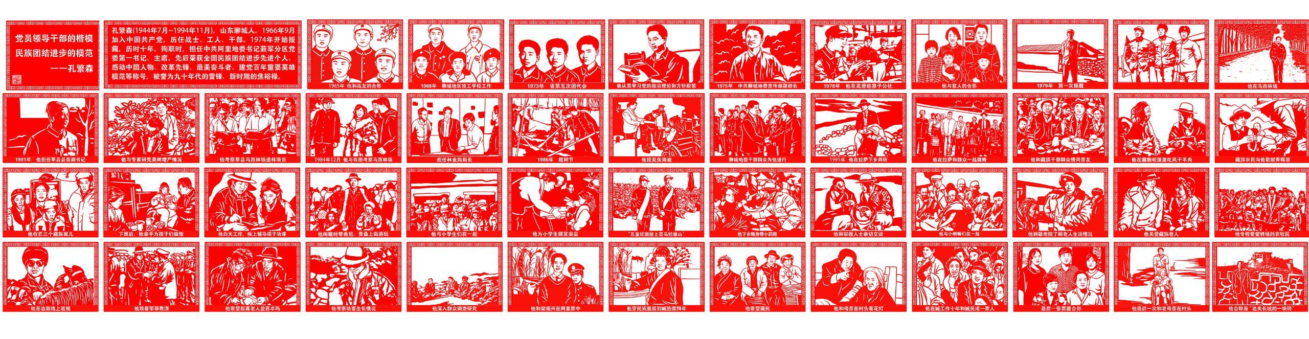 这幅剪纸长卷以孔繁森同志一生的重要经历为素材,分为“考察莘县马西林场造林项目”“在拉萨下乡调研”“收养三名孤儿”等49个独立小幅作品,以时间为序组成25米长卷。长卷再现了孔繁森的经历,以及从聊城进藏工作的感人事迹。剪纸作品线条细腻流畅、图案生动传神。