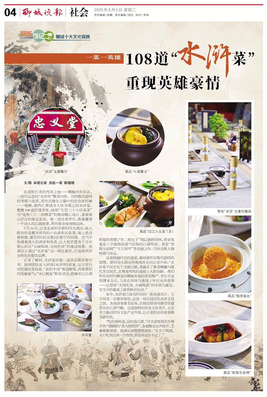 记者了解到,水浒宴的每一道菜品都有据可考。厨师团队深入研读《水浒传》原著,从字里行间挖掘饮食线索。“武松牛肉”筋道醇厚,再现景阳冈英雄豪气;“宋江鲤鱼”鲜美灵动,隐喻宋江江湖斡旋的智慧;“孙二娘包子”则以独特风味,带食客重走十字坡那段荡气回肠的江湖传奇。更有“智取生辰纲”“天王卸甲”等创意之作,巧妙关联人物性情与命运。