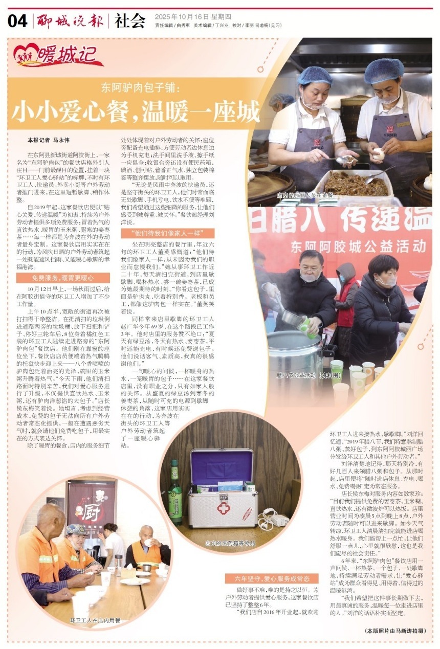 6年来,“东阿驴肉包”餐饮店用一声问候、一杯热茶、一个包子、一处歇脚地,持续满足劳动者需求,让“爱心驿站”成为群众看得见、用得着、信得过的温暖港湾。