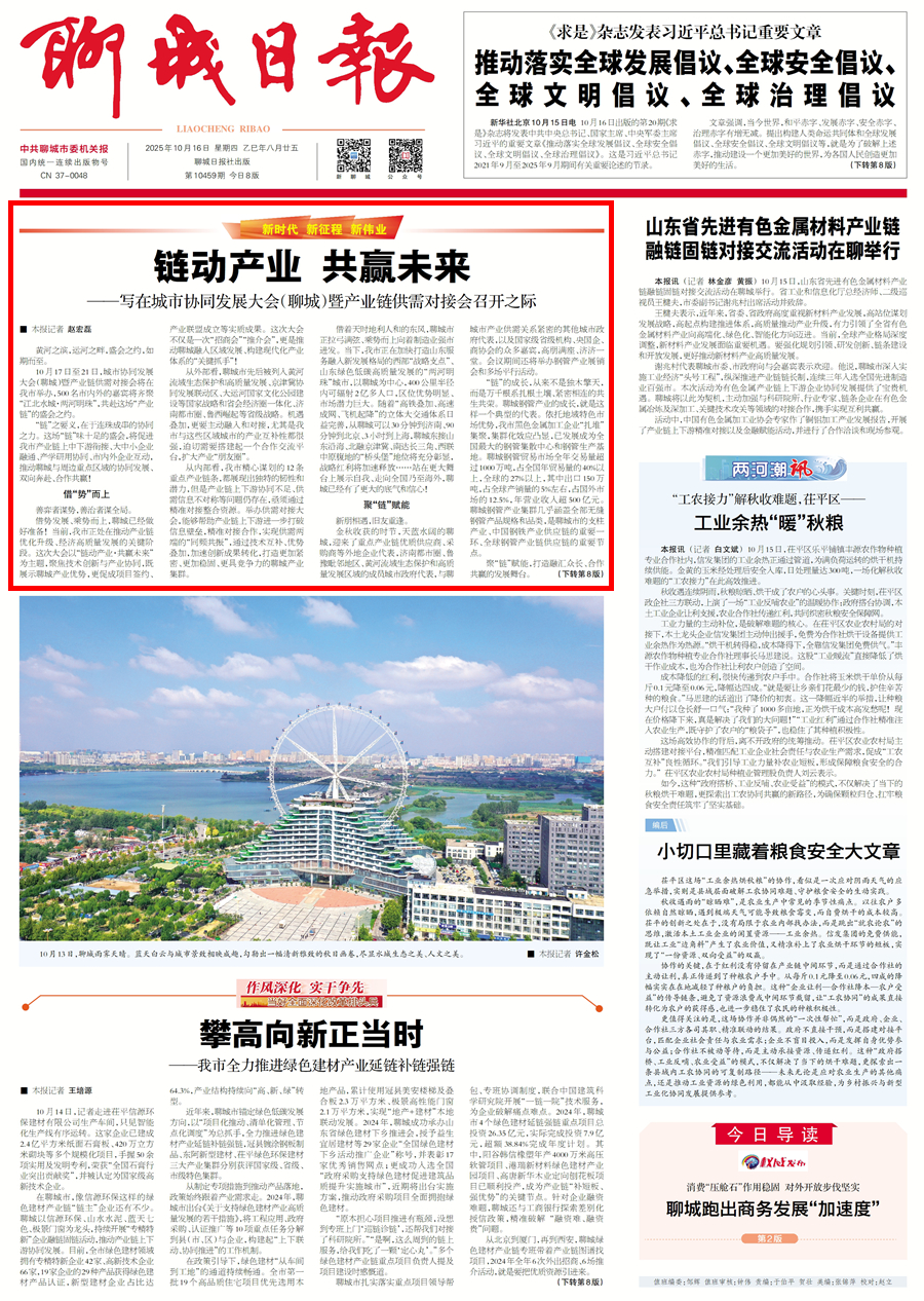 10月17日至21日,城市协同发展大会(聊城)暨产业链供需对接会将在我市举办,500名市内外的嘉宾将齐聚“江北水城·两河明珠”,共赴这场“产业链”的盛会之约。