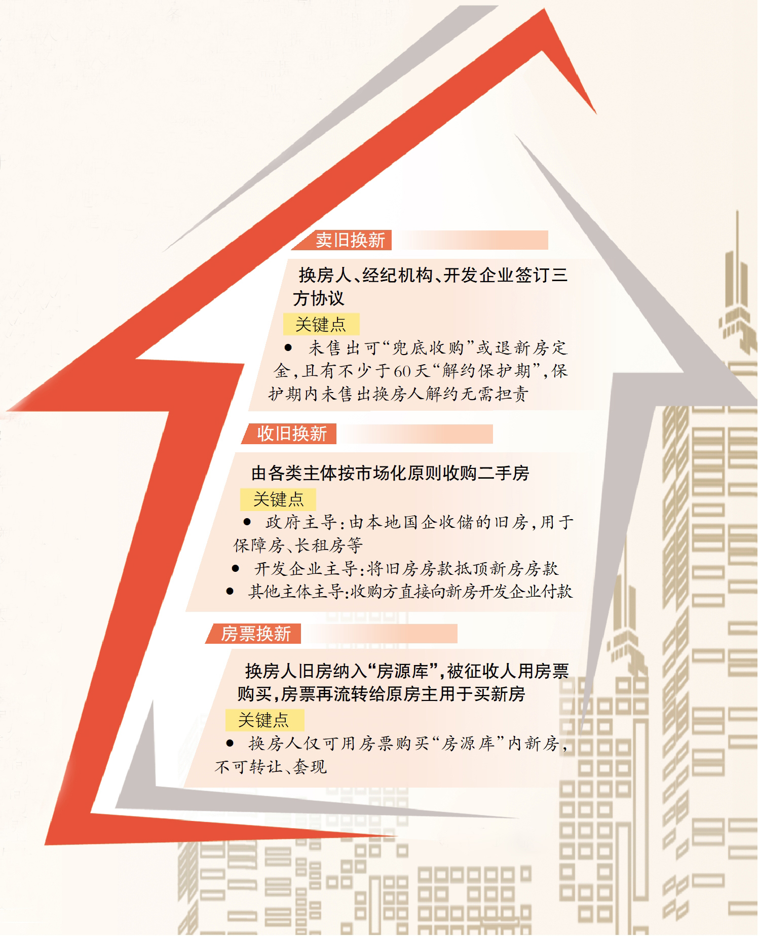 方案推出三大“换新”模式。首先是“卖旧换新”:换房人、经纪机构、开发企业签三方协议,约定时间内旧房售出则办理新房购买手续;未售出可“兜底收购”或退新房定金,且有不少于60天“解约保护期”,如保护期内未售出,换房人解约无需担责。其次是“收旧换新”:各类主体按市场化原则收购二手房,价格可协商或由第三方评估确定。政府主导的由本地国企收储的旧房,用于保障房、长租房等;开发企业主导的可将旧房房款抵顶新房房款;其他主体主导的则由收购方直接向新房开发企业付款,结算后同步办理网签与登记。最后是“房票换新”:换房人旧房纳入房票安置“房源库”,被征收人用房票买旧房后,房票流转至换房人,换房人仅可用房票购买“房源库”内新房,不可转让、套现。