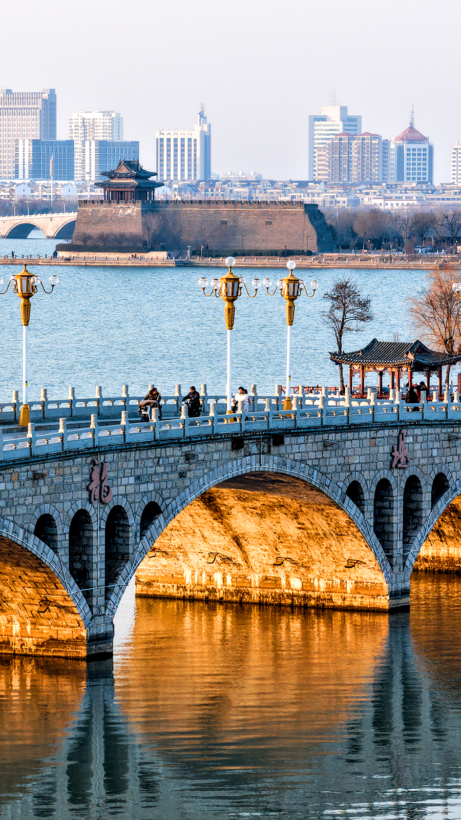 12月21日冬至当日傍晚,聊城南关桥出现“金光穿洞”自然奇观。夕阳低垂,金色的光芒如精准的箭矢,穿过南关桥的每一孔桥洞,将东昌湖的水面染成一片暖金。