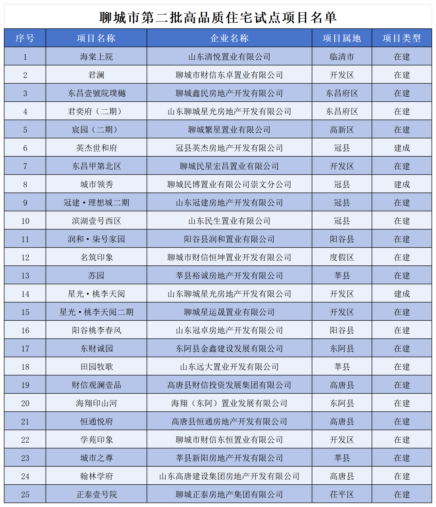入选名单的项目有:海棠上院、君澜、东昌壹號院璞樾、君奕府(二期)、宸园(二期)、英杰世和府、东昌甲第北区、城市领秀、冠建・理想城二期、滨湖壹号西区、润和・柒号家园、名筑印象、苏园、星光・桃李天阅、星光・桃李天阅二期、阳谷桃李春风、东财诚园、田园牧歌、财信观澜壹品、海翔印山河、恒通悦府、学苑印象、城市之尊、翰林学府、正泰壹号院等项目,共计25个。