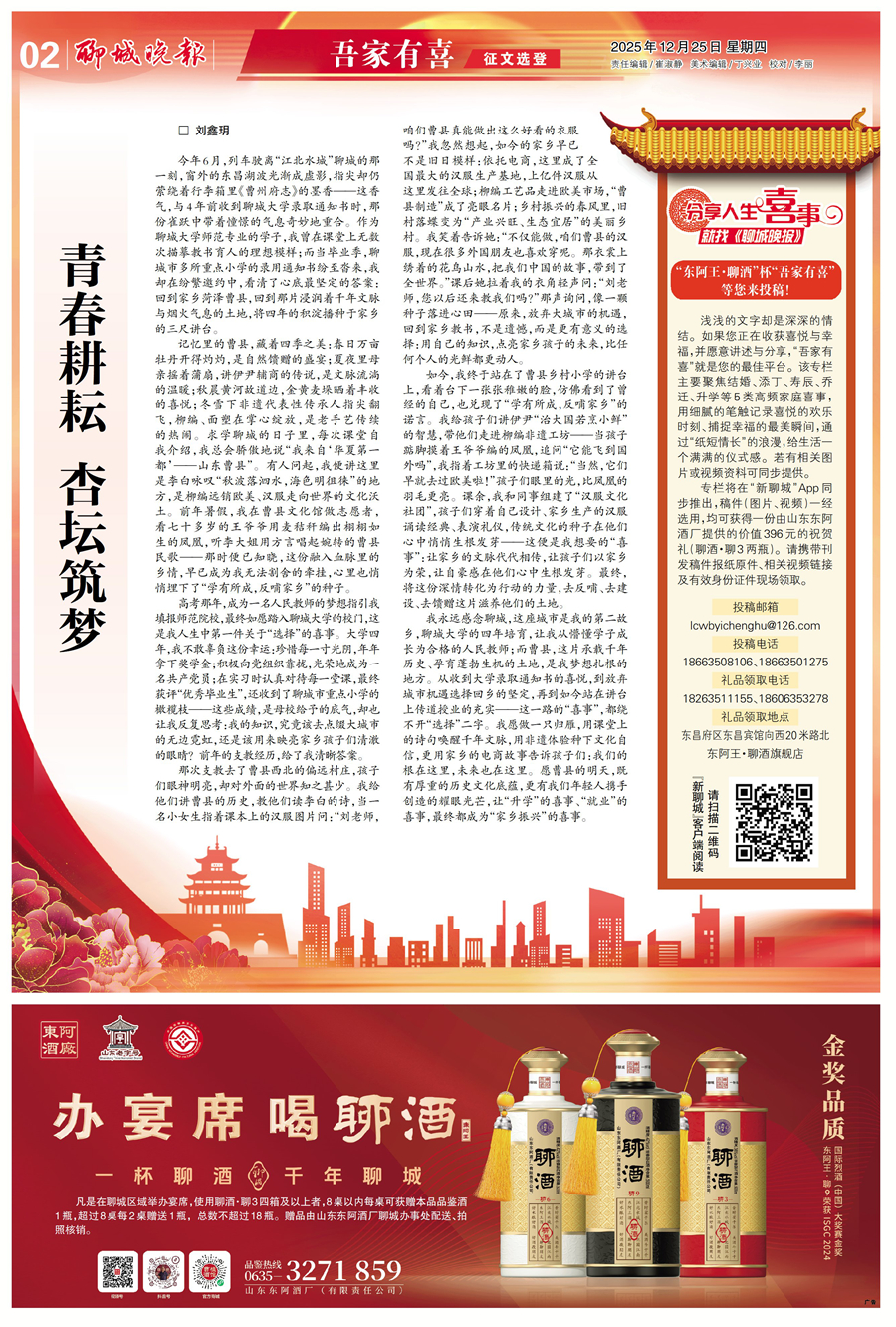 专栏将在“新聊城”App同步推出,稿件(图片、视频)一经选用,均可获得一份由山东东阿酒厂提供的价值396元的祝贺礼(聊酒·聊3两瓶)。请携带刊发稿件报纸原件、相关视频链接及有效身份证件现场领取。