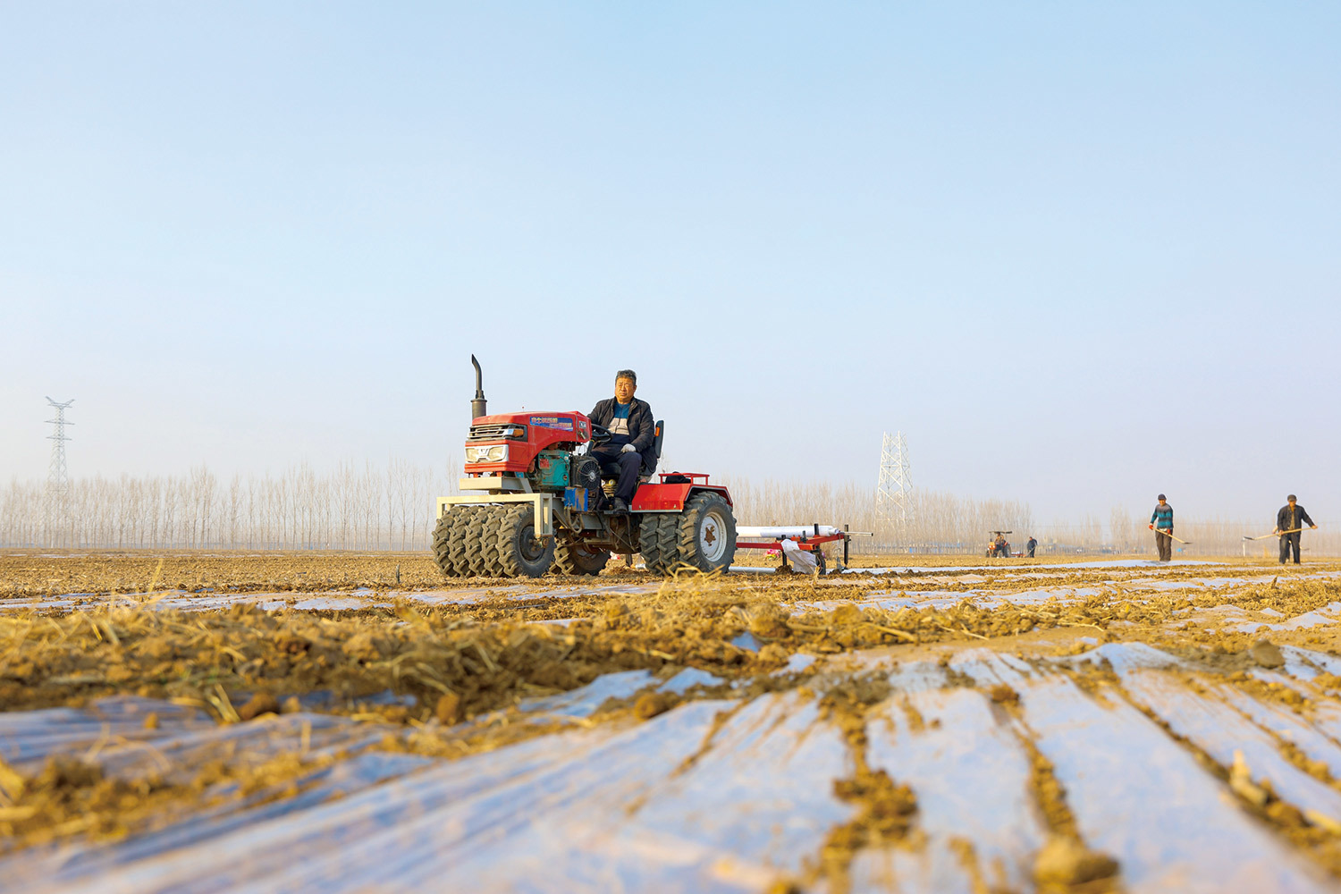 1月5日,在茌平区冯官屯镇高岭村,农民驾驶农机给小麦覆盖地膜,促进小麦越冬期继续生长。
