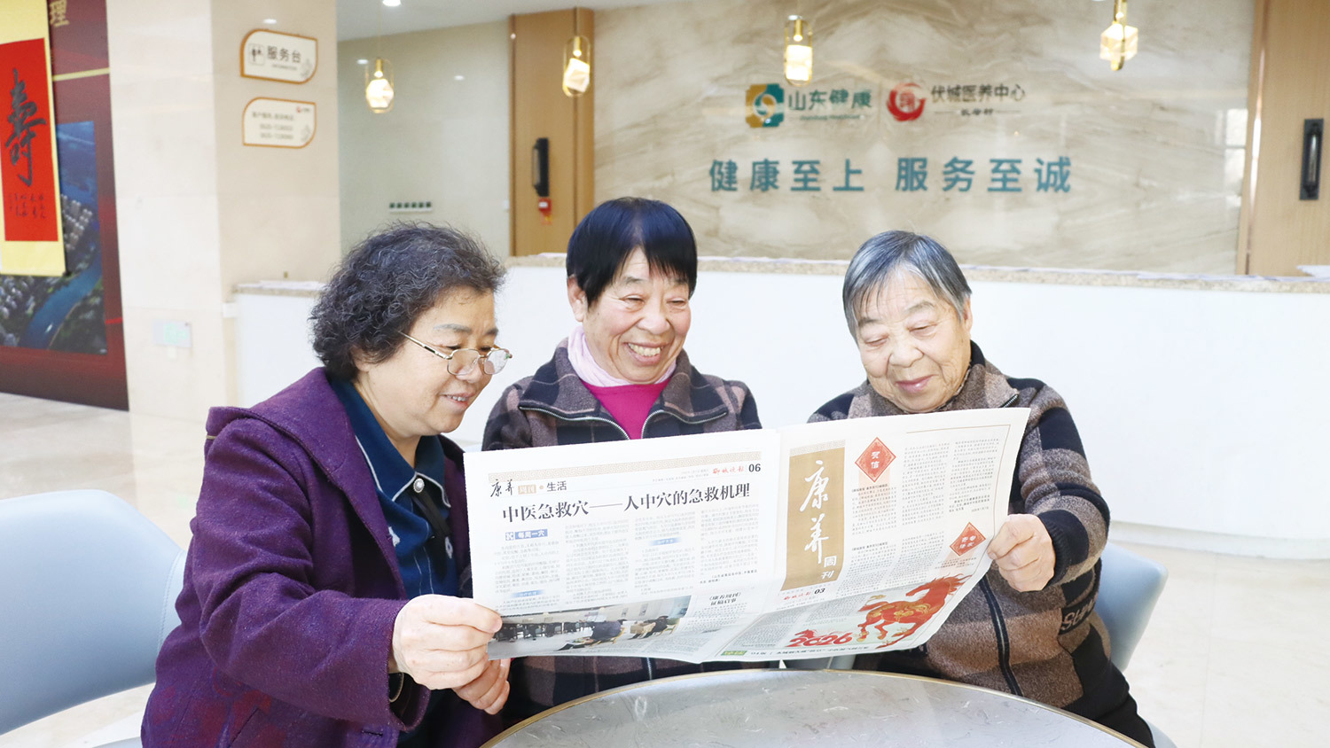 1月8日,阳谷伏城医养中心,老人们在阅读《聊城晚报·康养周刊》。(本报通讯员 刘婷 摄)