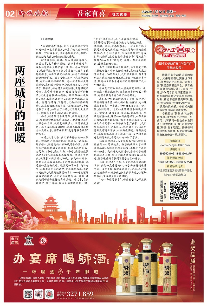 专栏将在“新聊城”App同步推出,稿件(图片、视频)一经选用,均可获得一份由山东东阿酒厂提供的价值396元的祝贺礼(聊酒·聊3两瓶)。请携带刊发稿件报纸原件、相关视频链接及有效身份证件现场领取。