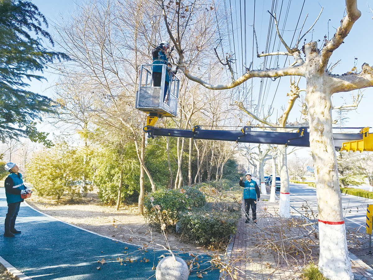 1月13日,市城管局园林中心工作人员对湖南路上的法桐进行修剪。