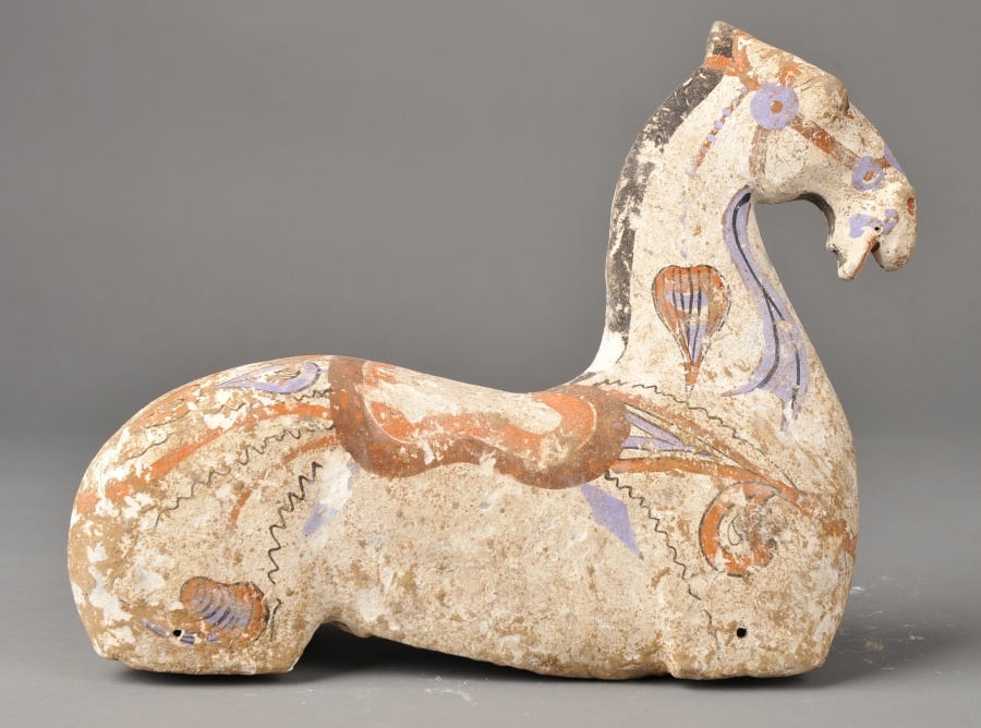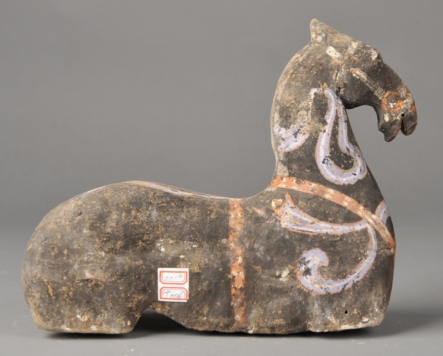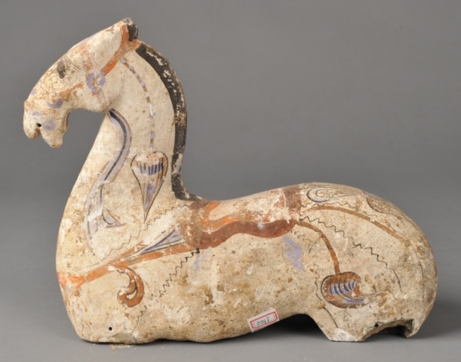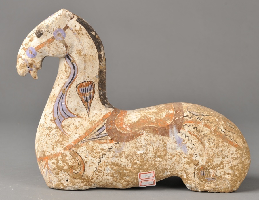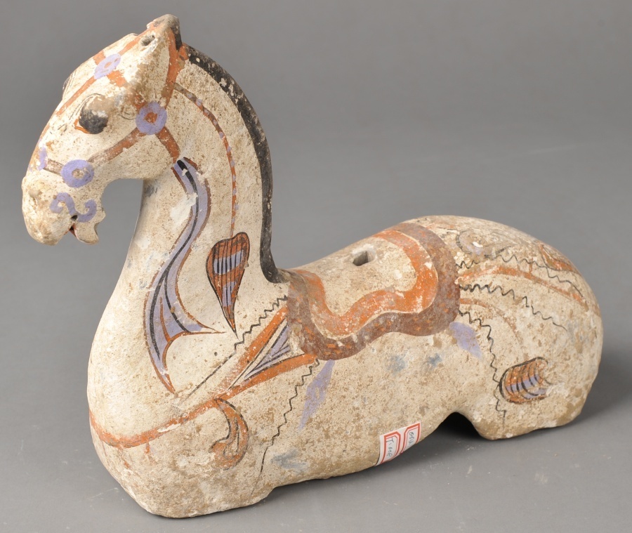 这组东汉彩绘陶马为国家二级文物,长28cm、宽6cm、高24cm,泥质灰陶,模制。陶马翘首、立鬃,嘴微张,躯体修长。马首顶部有两孔,肢体与躯干连接处为四凹槽,臀尾部有一圆孔。马身多施白陶衣,敷褐红彩,绘鬃毛、眼睛、辔头。纹饰以浅褐、黑线条勾勒,内填褐彩、紫彩,线条柔韧,气韵流畅,配色均衡。