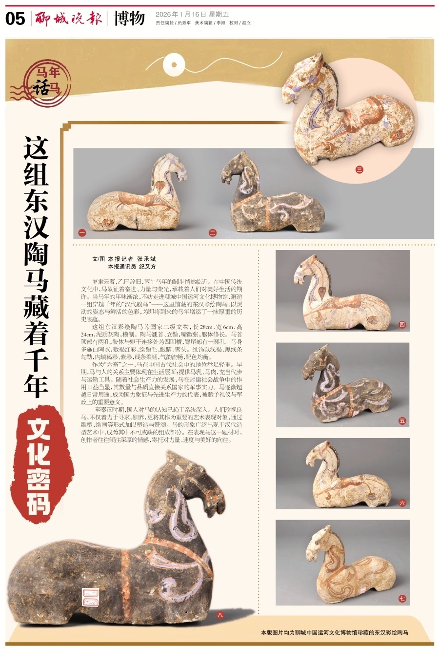 岁聿云暮,乙巳辞旧,丙午马年的脚步悄然临近。在中国传统文化中,马象征着奋进、力量与荣光,承载着人们对美好生活的期许。当马年的年味渐浓,不妨走进聊城中国运河文化博物馆,邂逅一组穿越千年的“汉代骏马”——这里馆藏的东汉彩绘陶马,以灵动的姿态与鲜活的色彩,为即将到来的马年增添了一抹厚重的历史底蕴。