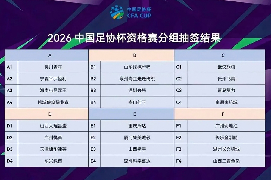 1月17日晚,2026中国足协杯资格赛抽签仪式举行。根据抽签结果,来自山东的聊城传奇绿业春足球队与广东的吴川青年、宁夏的平罗恒利以及海南的屯昌双玉共同落位A组。
