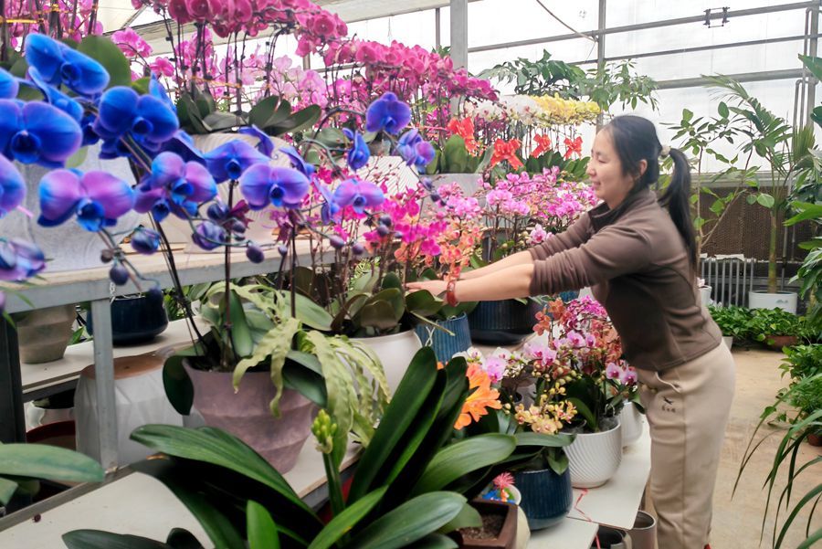 位于花园南路的聊大花卉园内,工作人员正在整理货架上的蝴蝶兰