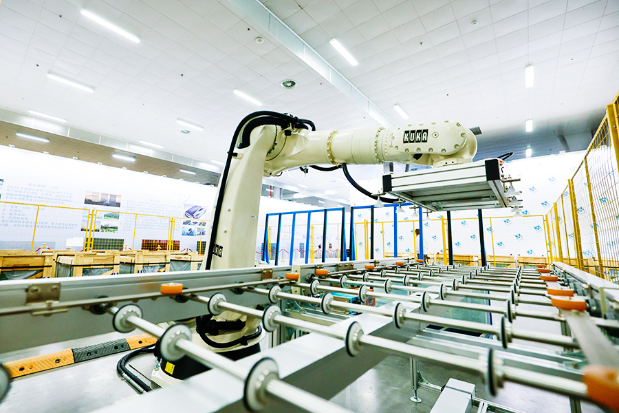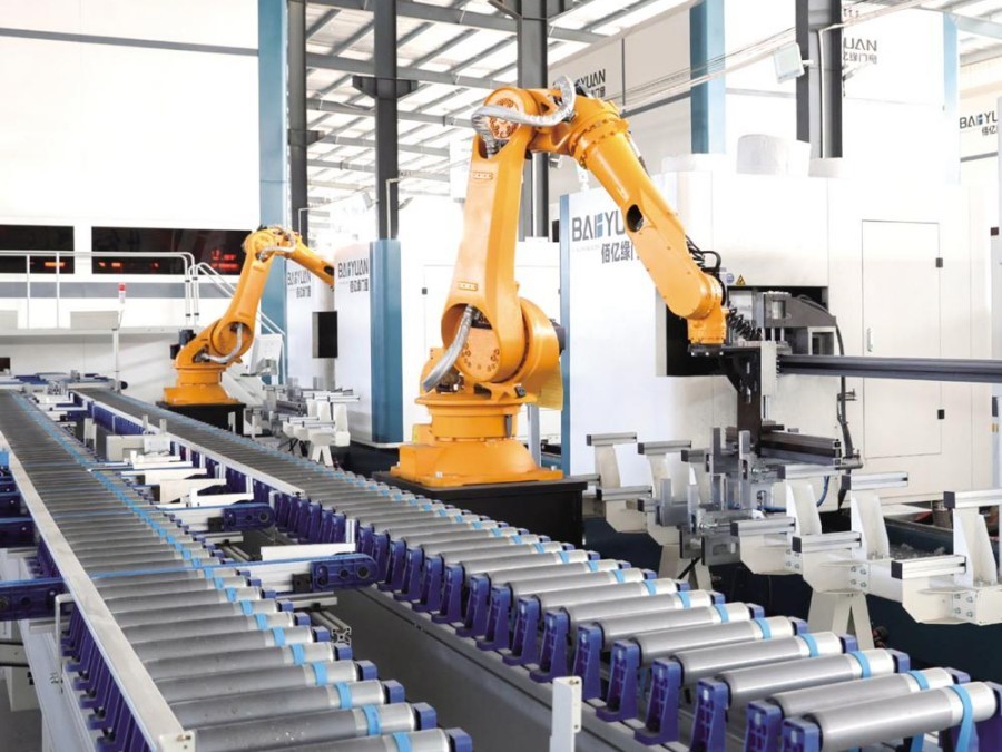 山东佰亿缘门窗有限公司车间内,生产线上的工业机器人在加工产品