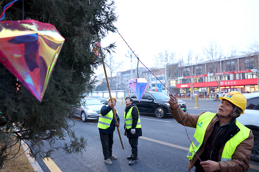 1月31日,聊城主城区东昌路两侧,工作人员正紧张有序地悬挂彩灯。一串串红灯笼与流光溢彩的灯饰为城市披上喜庆祥和的“新春盛装”,烘托出满满的年味。