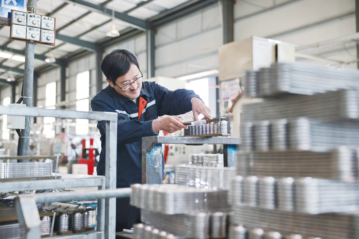 2月11日,聊城市德通交通器材制造有限公司生产车间内,工人在加工汽车配件。作为国家级专精特新“小巨人”企业、山东省制造业单项冠军企业,该企业生产的汽车配件产品远销北美及欧洲市场。