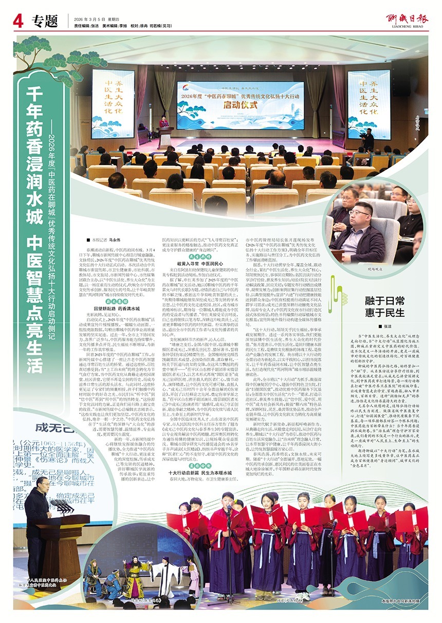春潮涌动启新程,中医药韵润水城。3月4日下午,聊城市新闻传媒中心报告厅暖意融融、文脉绵长,2026年度“中医药在聊城”优秀传统文化弘扬十大行动正式启动。本次活动由中共聊城市委宣传部、市卫生健康委、市社科联、市教体局、市文旅局、市新闻传媒中心、市传媒集团联合主办,以“中医生活化、养生大众化”为主题,以一场庄重而生动的仪式,吹响全市中医药文化传承创新、服务民生的号角,让千年岐黄智慧在“两河明珠”城市持续焕发时代光彩。