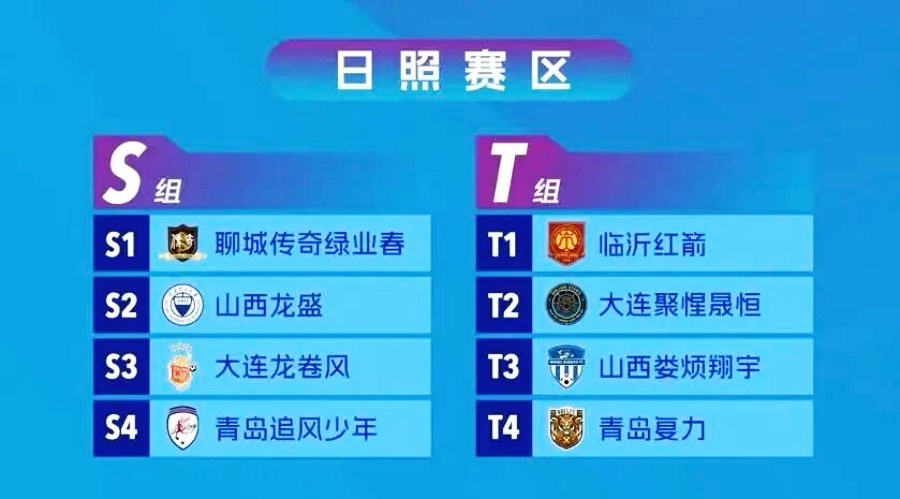 经过抽签,聊城传奇绿业春队和青岛追风少年队落位山东日照赛区S组,同组还有山西龙盛队和大连龙卷风队。临沂红箭队和青岛复力队落位T组,同组有大连聚惺晟恒队和山西娄烦翔宇队。日照赛区比赛时间计划为4月7日至17日。