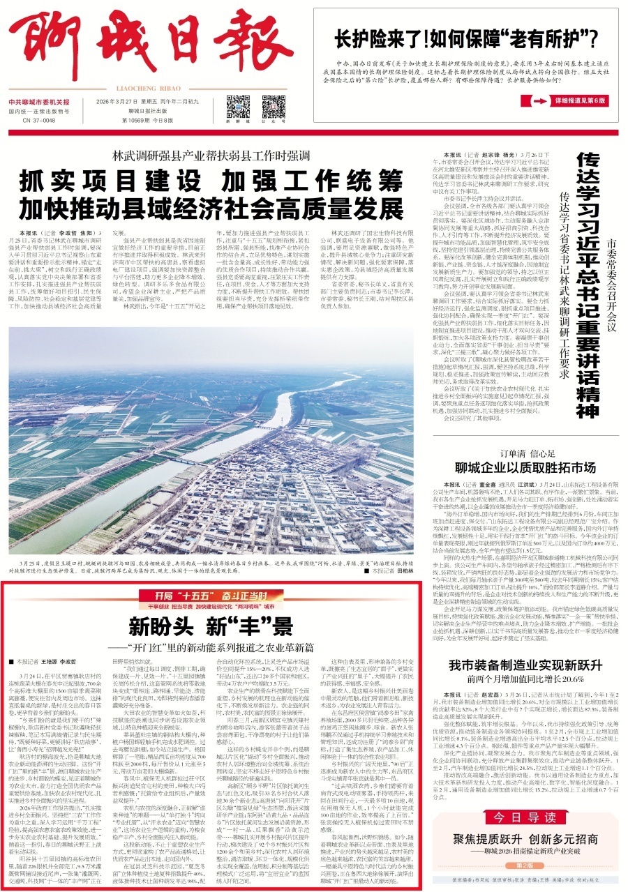 2026年政府工作报告提出,“扎实推进乡村全面振兴。坚持把‘三农’工作作为重中之重,深入学习运用‘千万工程’经验,提高强农惠农富农政策效能,进一步夯实农业农村基础、提升发展质效。”循着这一指引,春日的聊城沃野正上演着生动实践。