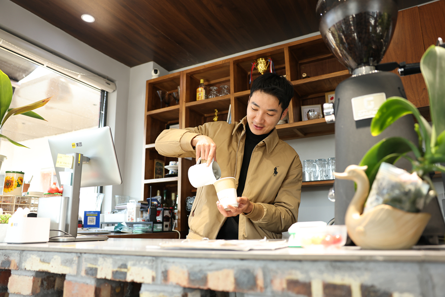 顾乡咖啡店内,刘洋在制作咖啡