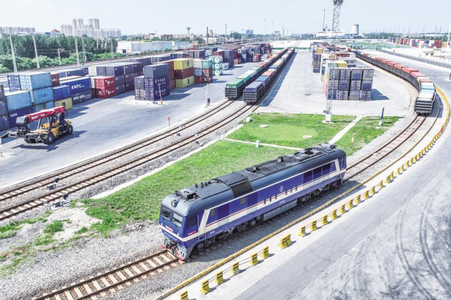 列车头驶入港口,准备与货箱对接
