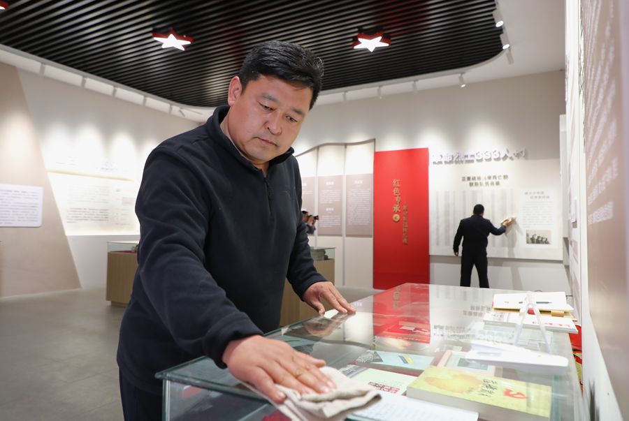 张家楼抗日英雄纪念馆,徐效冉擦拭陈列柜
