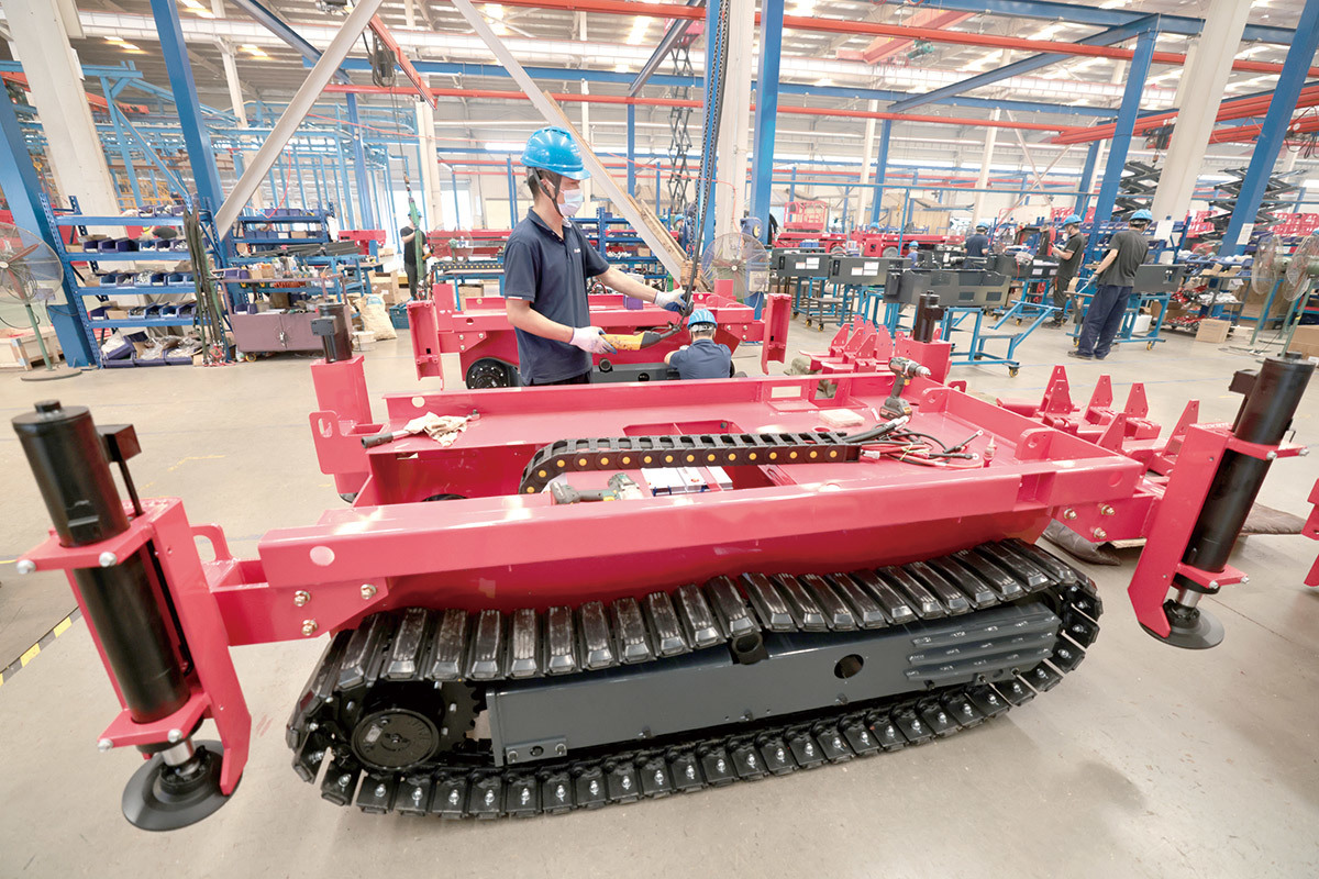 4月7日,在赫锐德(山东)智能科技有限公司,工人对生产的高空作业平台进行检查组装。该企业致力于高空作业平台设备的研发、制造、销售及服务,实现了产品的系列化、高端化和智能化,产品供不应求。