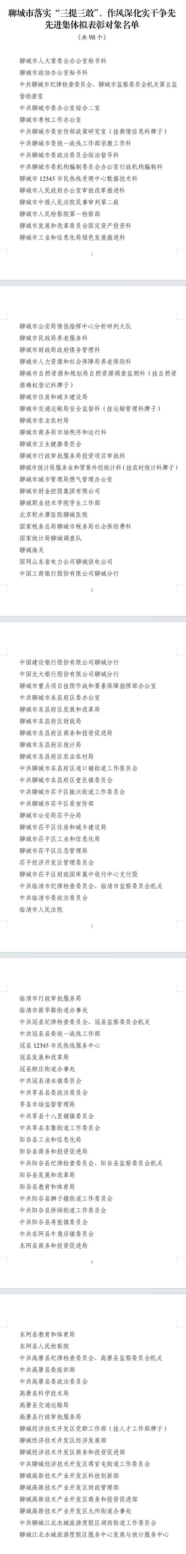 根据《关于开展聊城市落实“三提三敢”、作风深化实干争先先进集体和先进个人评比表彰工作的通知》要求,通过逐级推荐和评选,经市评比表彰领导小组研究确定,拟表彰聊城市落实“三提三敢”、作风深化实干争先先进集体98个、先进个人198名,现予以公示。