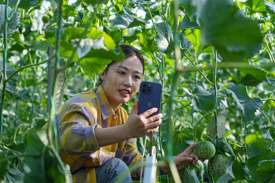 电商主播在大棚内直播推介香瓜