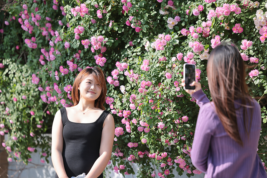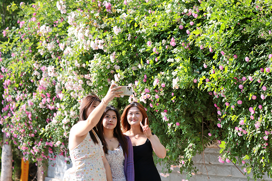 4月26日,聊城市主城区铃铛湖边的蔷薇花盛开,满墙繁花,为城市增添了一抹绚烂的色彩,成为市民游客休闲漫步、拍照取景的绝佳去处。