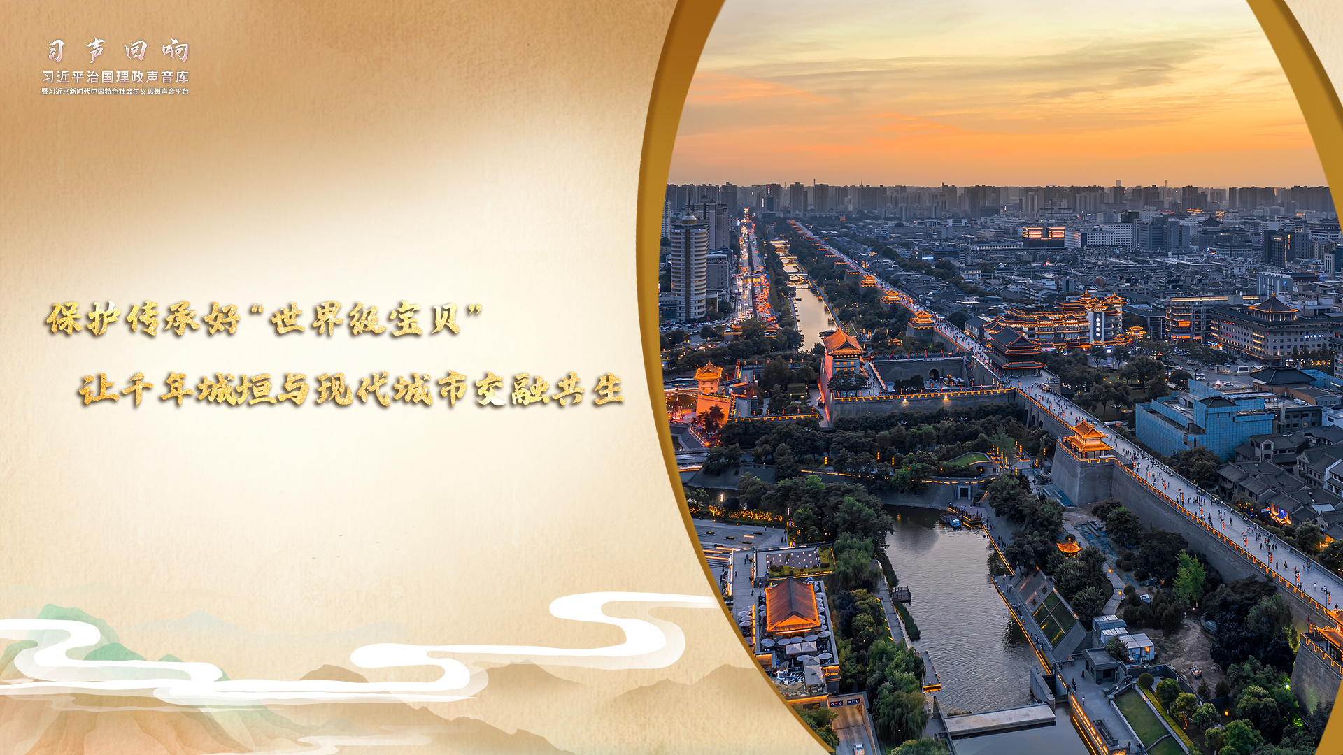 西安城墙,是中国现存规模最宏大、保存最完整的古代城垣建筑。2015年2月15日晚,正在西安考察的习近平总书记登上西安城墙,考察城墙保护情况。总书记说:“这是世界级的宝贝,要保护传承好。”