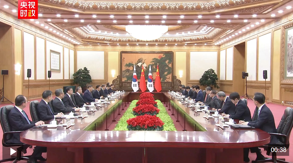 习近平指出,当前世界百年变局加速演进,国际形势更加变乱交织。中韩在维护地区和平、促进全球发展方面肩负重要责任,有广泛利益交集,应当坚定站在历史正确一边,作出正确战略选择。