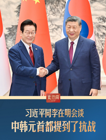 1月5日,国家主席习近平同韩国总统李在明举行会谈。习近平指出,中韩应当坚定站在历史正确一边,作出正确战略选择。会谈中,两国元首都提到了80多年前的抗战。