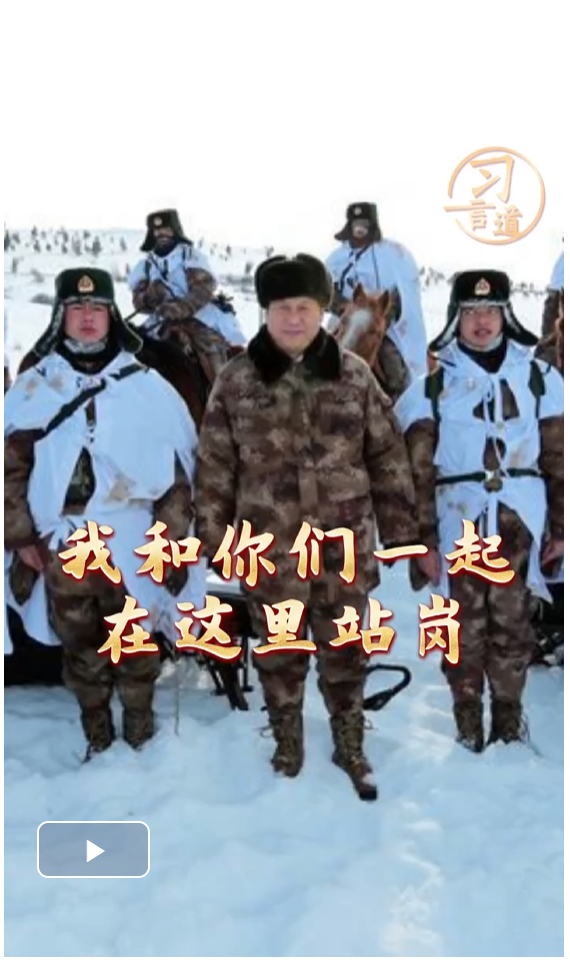 “我和你们一起在这里站岗。”2014年1月26日,习近平主席来到内蒙古阿尔山,冒着零下30多摄氏度的严寒,迎风踏雪慰问在边防线上巡逻执勤的官兵。统帅与士兵心连心,一步一履总关情。士兵,始终是习近平主席心头的牵挂。